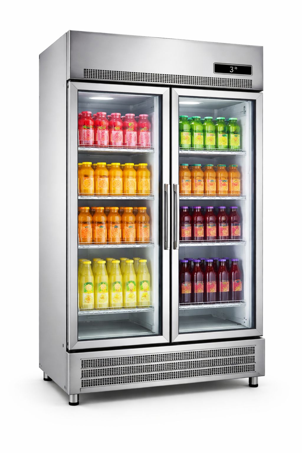 This double glass door commercial display refrigerator combines powerful cooling performance with an attractive presentation. The transparent doors allow easy product visibility while maintaining consistent internal temperature.
