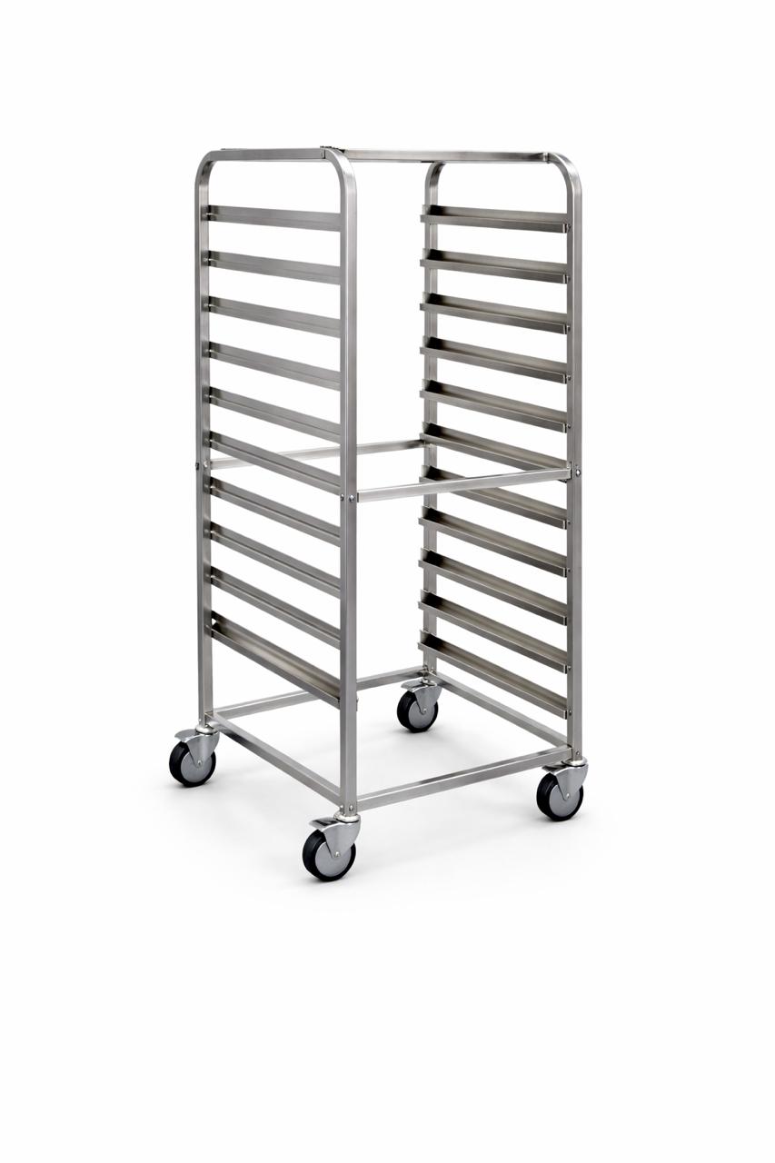 Built with a durable frame and multiple tray rails, this rack allows easy loading, storage, and transport of GN pans and baking trays. The smooth-rolling wheels ensure convenient mobility between prep areas, ovens, and service stations—making it perfect for events, hotels, and commercial kitchens.
